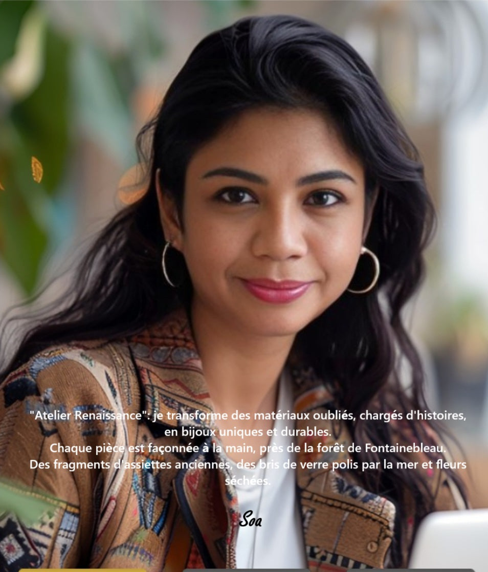 À travers mes bijoux et mes tableaux, je souhaite partager une vision du monde où la fragilité devient force, et où chaque morceau brisé, chaque éclat de verre, chaque fleur, chaque trace du passé trouve une nouvelle lumière. La beauté renaît de ce qui a vécu, de ce que le temps a marqué.