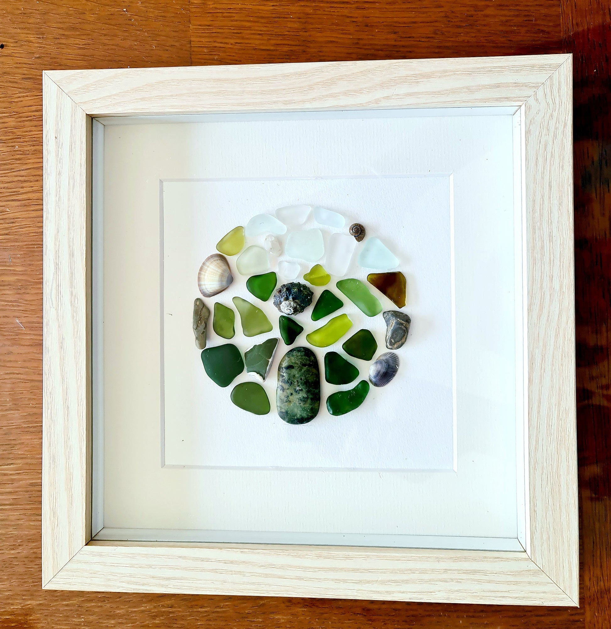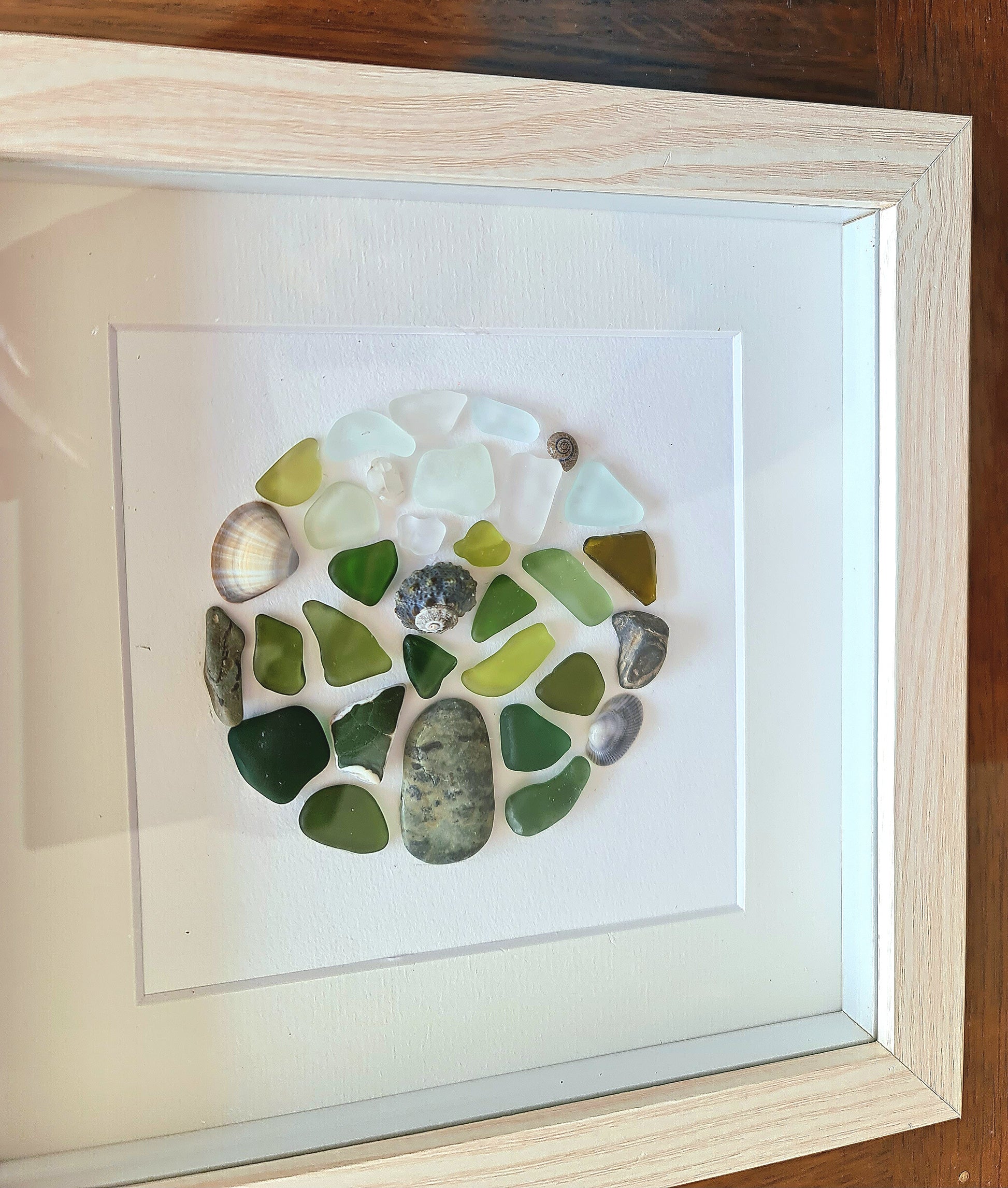 Tableau en verre de mer et coquillages – “Écume Marine” | Art mural fait main, déco nature, artisanat français, pebble art